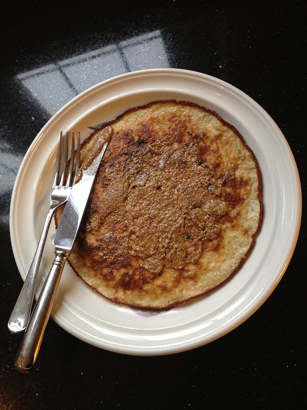 - The paleo two-ingredient pancake, first spotted from Lisa mentioned above. Simple as anything: as a breakfast, I mash 2 or 3 smallish bananas and mix in 3 eggs. NB bananas that have gone much more black than the kids would eat seem fine in this recipe. Also, a good result doesn't seem to be very dependent on precise amounts (thank goodness). The quantities mentioned here makes two decent pancakes for our breakfast. A bit of butter in a pan, on a medium heat: cook them slower than normal pancakes, and make sure they are properly setting before attempting a "flip" or it will end in tears! They take 3-4 minutes each. Tastes fantastic with almond butter (Mrs H's preference) or maple syrup (mine)