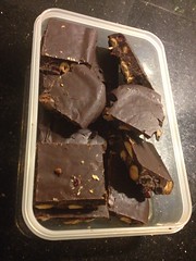 Dark chocolate with fruit and nut. We seem to be allowed dark chocolate, and dried fruit and nuts are also fine, so this seems legit so long as you don't have too much! Again, really easy: melt 300-400g of dark chocolate, preferably high cocoa content. I do this by putting a sieve over a pan of boiling water, and sitting a bowl in it. Then cut/grate the chocolate and keep stirring. Once it's mostly liquid it seems fine - a few lumps don't matter. While that's happening, roast some almonds and macadamia nuts (in a tray, under a grill for a few mins) and get some dried fruit. My last shot used these nuts, plus raisins and dried cranberries, since these happened to be available in Waitrose when I was shopping! I had probably 300g of fruit/nuts with 350g chocolate for the attempt in the photo - quite fruit/nut heavy, but worked well for me. Anyway - melt the chocolate, then mix in the nuts and fruit, and pour into a tray with greaseproof paper. Cool in the fridge, cut into chunks and try not to eat too quickly!- Shopping tip: have some cooked chicken chunks in the fridge. Again, a snacking essential...
