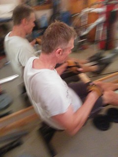 I haven't rowed regularly since leaving the gym about 4 years ago, so this was always going to be quite a challenge. We decided to take turns doing a timed 1k each, thus rowing 5k each and 10k between us. There was something like a 30 second changeover time between our sessions, to adjust footstraps and so on (for "so on" read "splutter, stagger, attempt to stay in the land of the living").
