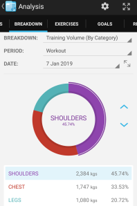 Accompanied variously by a deeply offensive Spotify playlist and some sketches from John Finnemore's Souvenir Programme on iPlayer Radio, we worked our way through overhead presses, bench presses, lateral/front raises and squats. Everything was still hurting from Saturday, but nevertheless we managed a decent stint. Here's a screenshot from my weights tracking app, to give a rough idea.