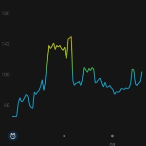 Friday: circuits, the same as on Monday. Challenge week with the folks at FFS. I pushed as hard as I could under the circumstances, and managed to get a little bit further than Monday (just over 7 times round the circuit this time). Turns out the whole period was captured pretty nicely through my heart rate monitor; it felt pretty well how it looks.